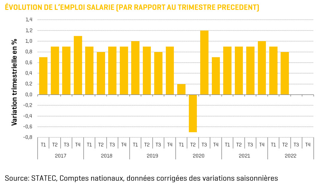 The increase in salaried employment continues: in the second quarter of 2022, the salaried employment market rose by 0.8% compared to the first quarter of 2022. In annual variation, the increase was +3.6%. Specialized activities and support services (+1.4%) and information and communication activities (+1.2%) showed the largest increases.