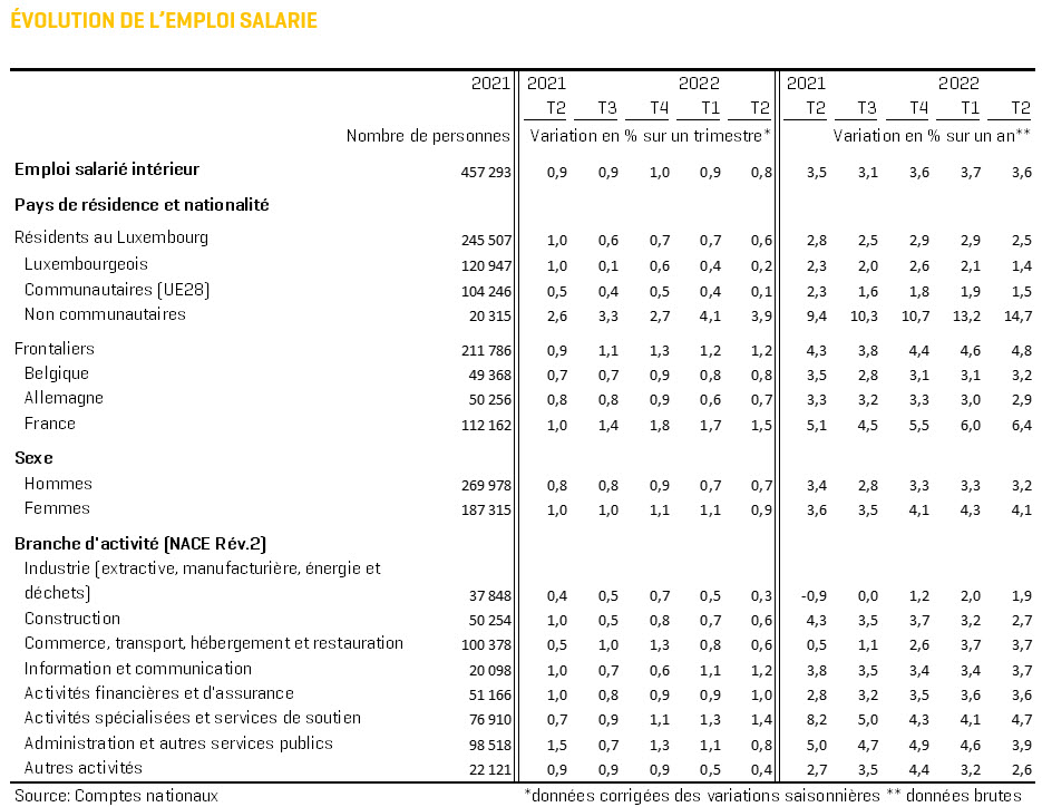The number of cross-border employees (+1.2% compared with the previous quarter) rose more strongly than the number of residents (+0.6%). In annual variation, the number of non-EU residents rose by 14.7% (+1.4% for Luxembourg residents).