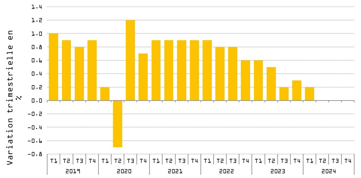 Growth in salaried employment continues to slow: in the first quarter of 2024, there was a moderate increase of +0.2% compared with the fourth quarter of 2023. In annual variation, the increase was only +1.1%, compared with +1.6% in the fourth quarter of 2023. Financial and insurance activities (+0.5%) and public administration and other public services (+0.9%) show the strongest quarterly increases compared to the fourth quarter of 2023. For two sectors of activity (industry and construction), a decline in the number of employees is again recorded in the first quarter of 2024.