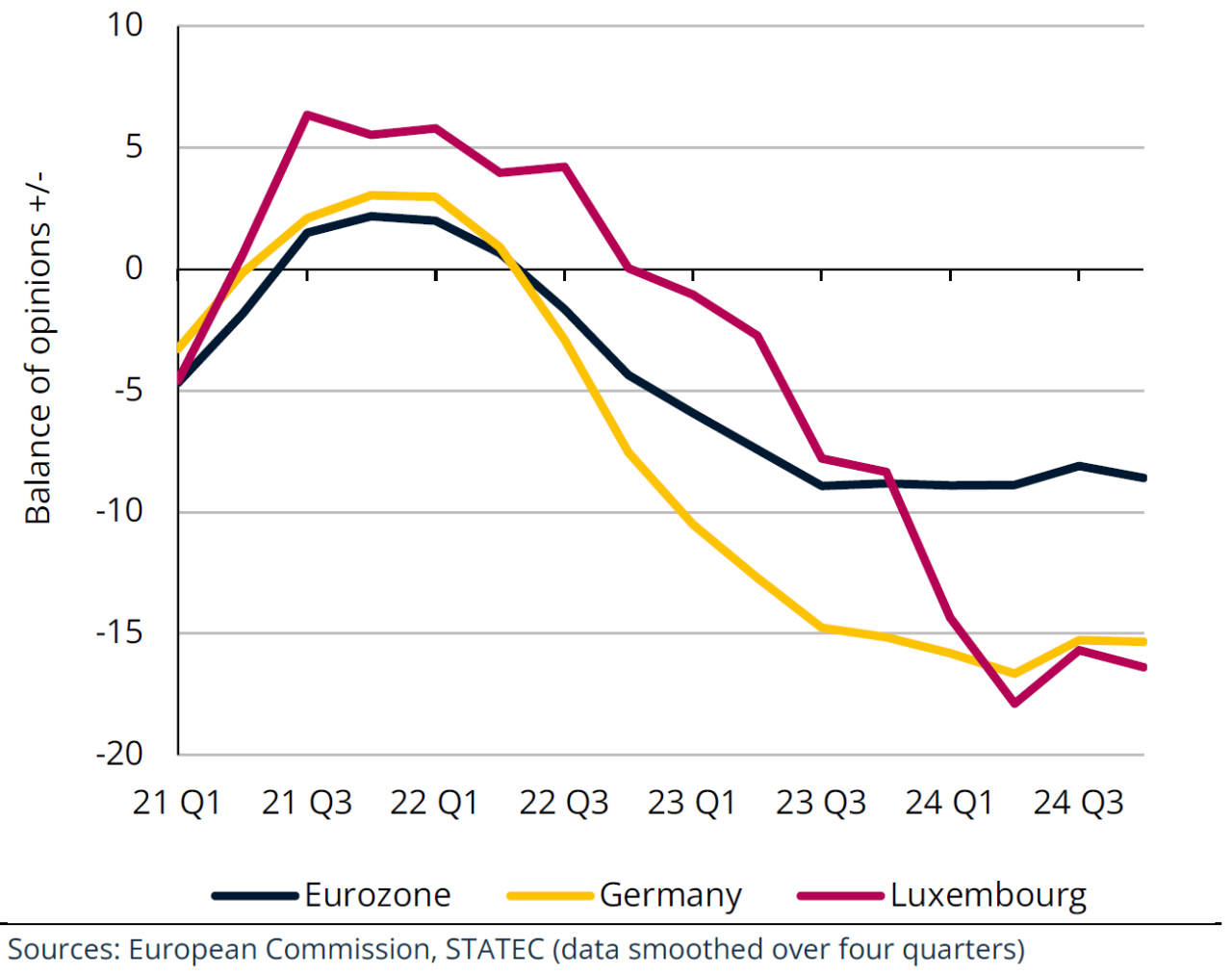 Generally speaking, the morale of Luxembourg manufacturers has been a little more upbeat since mid-2023 (while it continues to fall in the eurozone). Nevertheless, it shows major fluctuations from one month to the next, linked in particular to highly volatile production forecasts in the metallurgy sector.