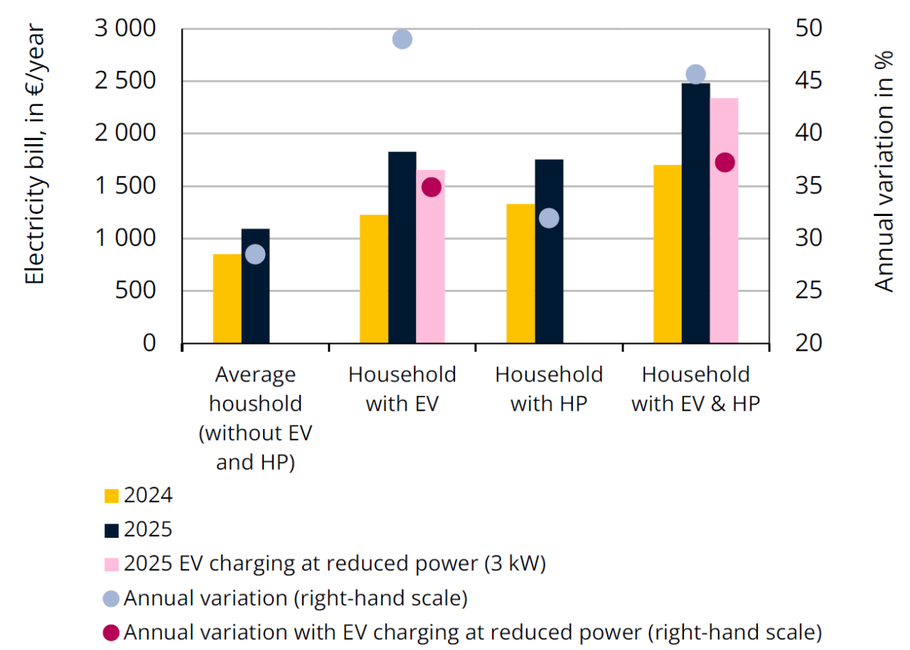 The impact of these changes varies from household to household, depending in particular on their electrical equipment. For an average household with an annual consumption of around 3,900 kWh, without an electric vehicle (EV) or heat pump (HP), the increase will be just under 30%. A household with a heat pump will see an increase of just over 30%. For a household using an electric vehicle, if charging is carried out using an 11 kW domestic charging point, the increase could be almost 50%. On the other hand, by reducing the charging power to 3 kW, the increase would be limited to around 35%.