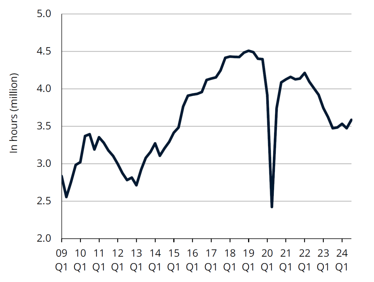 Hours worked by temporary staff rose by 3.3% over the quarter in Q3 2024, the strongest increase since Q3 2020 (or since Q4 2017 excluding the Covid crisis). This upturn came mainly from construction (+4.0% over a quarter in Q3 2024), but also from transport (+6.3%) and industry (+1.8%). The number of temporary workers stabilised at just over 7 000 for the first three quarters of 2024 - around 20% below its pre-pandemic level (a fall equivalent to around 1 800 persons).