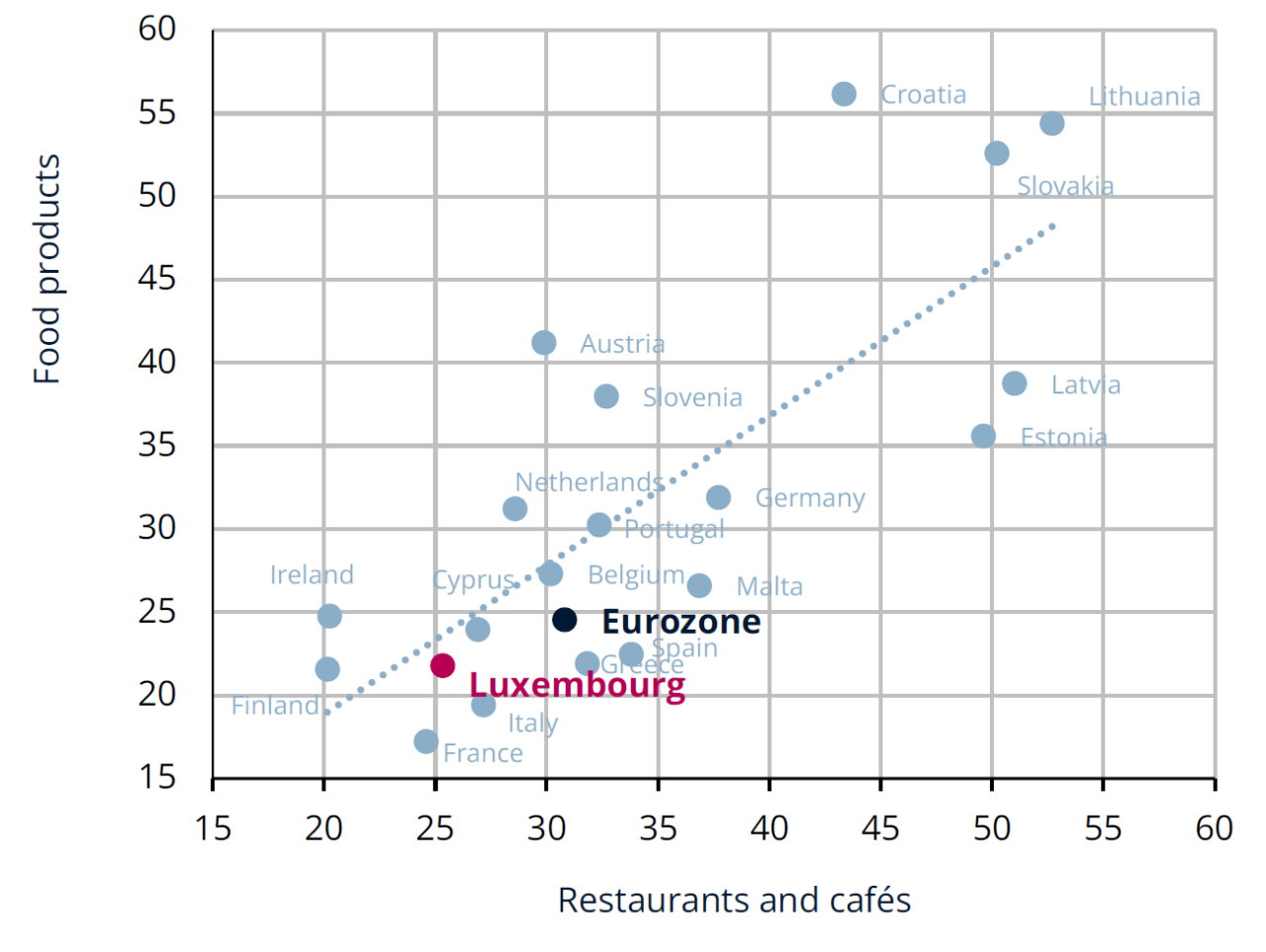 It is worth noting that in Luxembourg, it is the small caterers (+25% since Dec 2019) that have posted the highest increases in prices, followed by drinks in restaurants (+24%) and non-alcoholic drinks in cafés (+22%), with meals in restaurants (+21%) and, lastly, alcoholic drinks in cafés (+19%).