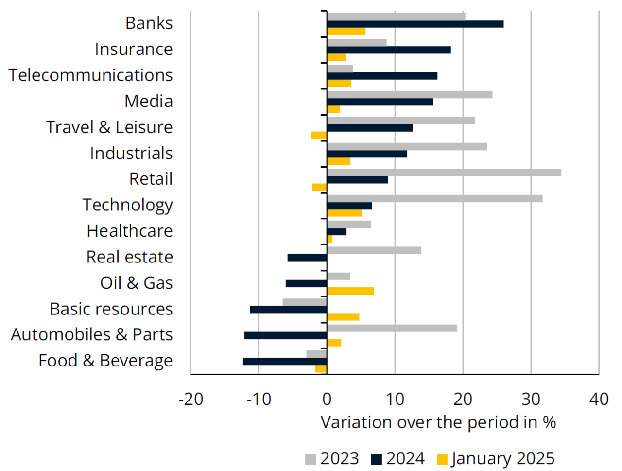 In the wake of a 13% increase in 2023, the Euro Stoxx 600 European stock market index rose by 6% in 2024. It was boosted by encouraging earnings in banking, insurance and telecommunications, three sectors that continue to rise at the start of 2025. Valuations in the industrial, retail and technology sectors slowed sharply in 2024 and early 2025, while real estate has been on a downward trend since autumn 2024. Stocks linked to the oil, gas, basic resources and automotive sectors, which had fallen dramatically in 2024, are back on the rise at the start of 2025.