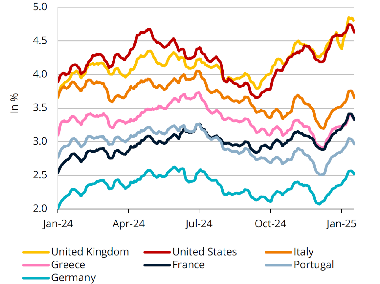 In mid-January, sovereign yields started to fall again, buoyed by weaker-than-expected inflation figures in the United States and the United Kingdom. Following a fall in US sovereign yields, European yields followed suit. On the futures markets, projections point towards a rate cut by the Fed in July 2025