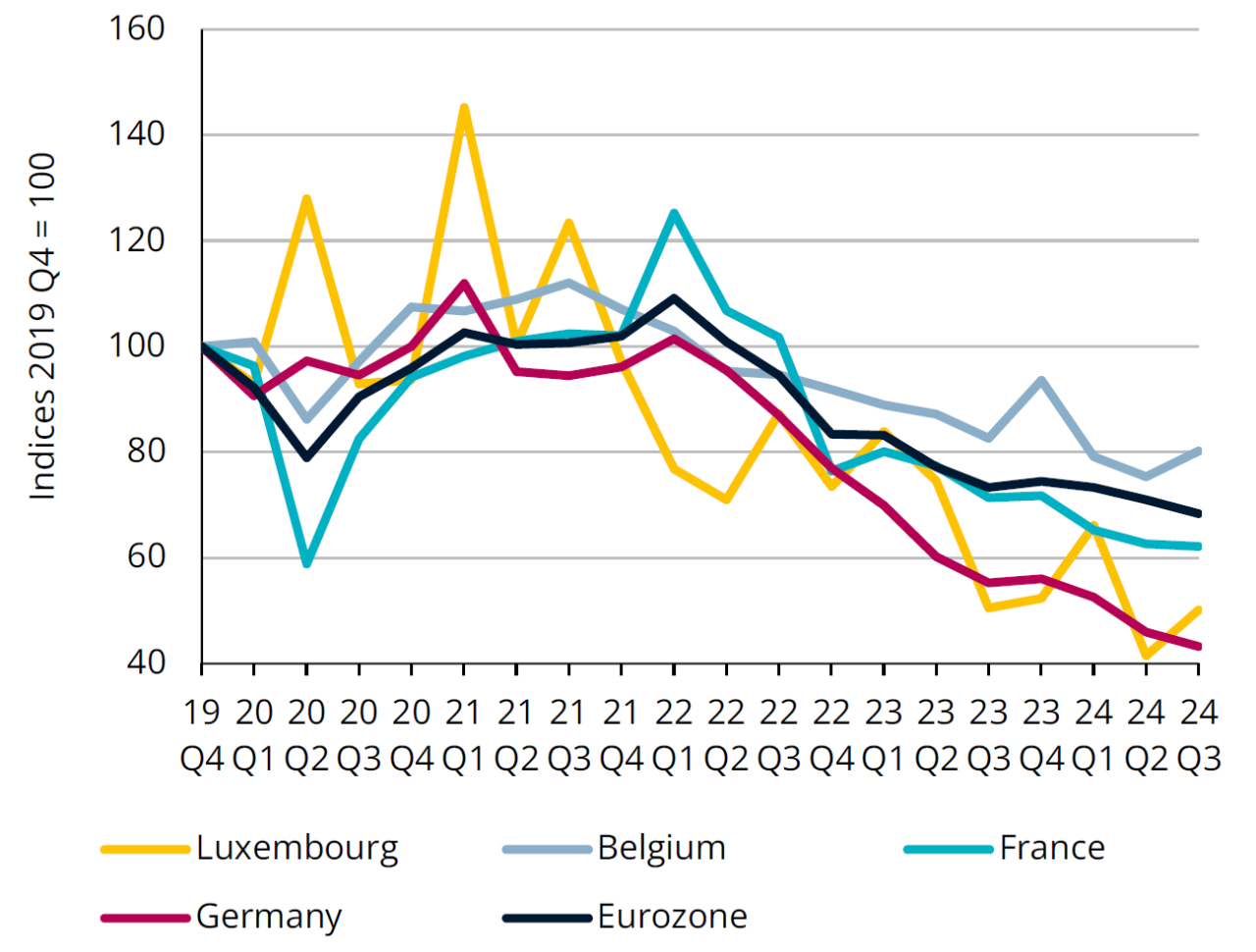 Mirroring the situation in Luxembourg, building permits in the eurozone began to fall at the start of 2022 and have yet to show any signs of recovery. Across the eurozone as a whole (including Germany and France) permits for non-residential buildings held up better than those for residential buildings, while in Luxembourg both categories were hit hard. The low levels of building permits in recent quarters suggest that the situation will remain challenging for investment and activity in construction in 2025.