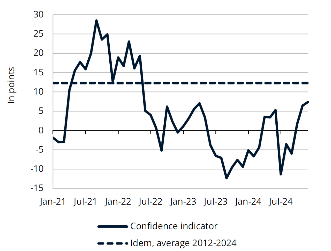 The morale of Luxembourg's non-financial services companies has been affected by considerable volatility over the past year. It recovered significantly in the first half of 2024 and fell back slightly in Q3. Subsequently, it has resumed its upward trend. In December 2024, the corresponding confidence indicator reached 7.4 points, the best result since May 2022 (but still below its long-term average).