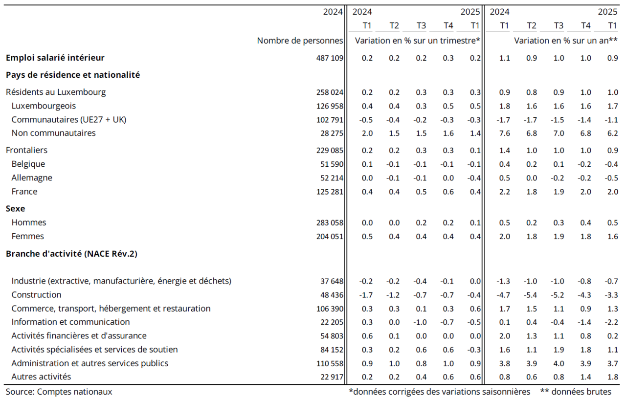 Finally, in the first quarter of 2025, the number of resident employees grew slightly more than the number of cross-border workers (+0.3% compared to the fourth quarter of 2024 for residents, compared to +0.1% for cross-border workers). However, the number of German and Belgian cross-border employees fell compared with the first quarter of 2024, with declines of 0.5% and 0.4% respectively.