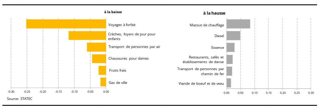 Note: The positions shown in the graphs are those that had the greatest influence on the monthly change in the overall index. These contributions result from monthly price changes as well as the weight of each position within the basket of goods and services. The sum of the individual contributions of all positions in the basket corresponds to the monthly change in the overall index.