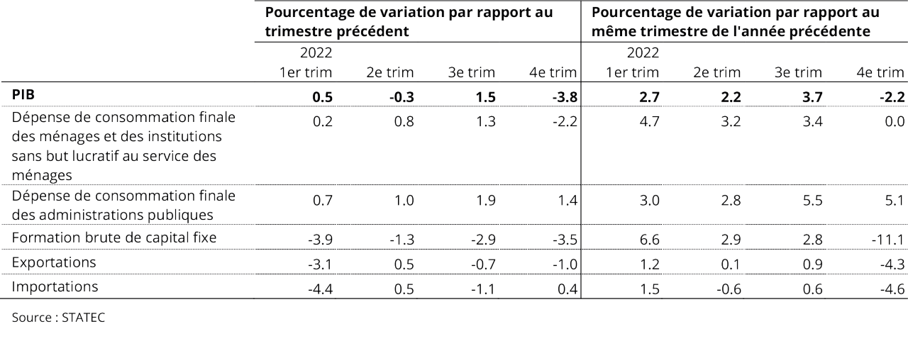 Par rapport au troisième trimestre 2022, la dépense de consommation finale des ménages et des institutions sans but lucratif au service des ménages a diminué de 2.2%, alors que celle des administrations publiques a augmenté de 1.4%. La formation brute de capital diminue de 3.5%. Les exportations ont diminué de 1.0%, alors que les importations ont augmenté de 0.4% (voir tableau 3).