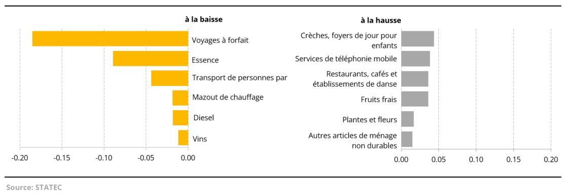 Du côté des services, des hausses de prix ayant une forte contribution au taux d’inflation ont été relevées pour les crèches et foyers de jour pour enfants (+2.8%), les services de téléphonie mobile (+6.1%), ainsi que dans le secteur de la restauration (+0.6%).
