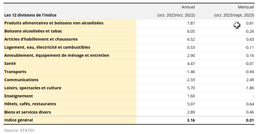 Le taux annuel d’inflation se fixe à 3.2% contre 4.1% un mois plus tôt. Le taux annuel d’inflation sous-jacent perd 0.1 point de pourcentage et s’établit à 4.2% en octobre. L'indice général du mois d’octobre exprimé en base 100 en 2015 se chiffre à 121.75 points. La moyenne semestrielle de l’indice raccordé à la base 1.1.1948 passe de 992.93 à 995.34 points. La prochaine indexation sera déclenchée lorsque la valeur de 1013.46 sera atteinte.