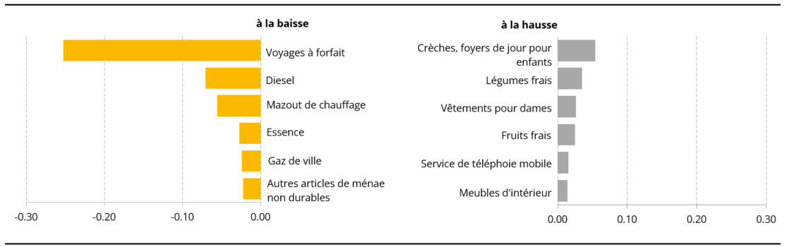 Note : Les positions représentées dans les graphiques sont celles ayant eu le plus d’influence sur l’évolution mensuelle de l’indice général. Ces contributions résultent de l’évolution mensuelle des prix mais aussi du poids de chaque position au sein du panier de biens et services. La somme des contributions individuelles de toutes les positions du panier correspond à l’évolution mensuelle de l’indice général.