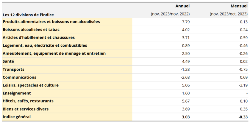 Les prix de l’alimentation gagnent 0.3% par rapport à octobre. Les plus fortes hausses ont été constatées pour les légumes frais (+5.0%), les fruits frais (+2.6%) et la viande de volaille (+1.1%). Du côté des baisses, le poisson frais (-4.3%), le fromage (-0.4%) et les pâtes alimentaires et le couscous (-2.6%) se démarquent. En comparaison annuelle, les prix alimentaires dans leur ensemble sont supérieurs de 7.9% en novembre 2023.