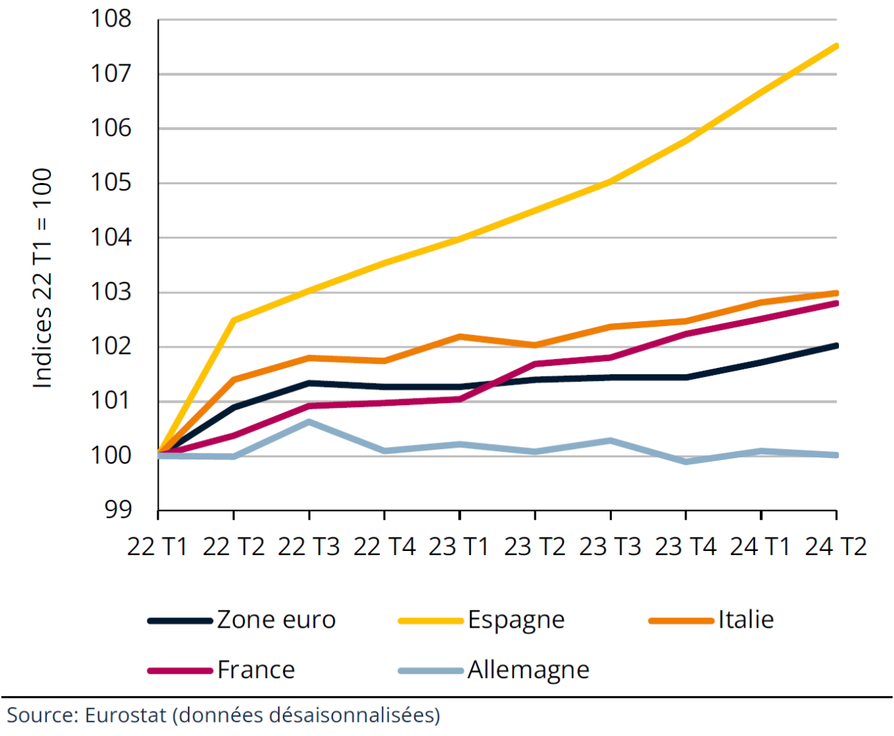Les résultats sont cependant contrastés entre les différents États membres et notamment ses poids lourds. Parmi ces derniers, l’Espagne avance toujours en tête (+0.8% sur un trimestre à la fois aux 1er et 2e trimestres), portée à la fois par les exportations (surtout de services, par le biais d’une fréquentation touristique élevée) mais aussi les différentes composantes de la demande intérieure (consommation privée et publique, investissement). Au 2e trimestre, l’Espagne contribue ainsi à presque 30% de la croissance relevée en zone euro, alors que son PIB ne représente qu’environ 10% de celui de l’union monétaire. À l’opposé, on retrouve l’Allemagne où le PIB a de nouveau repris le chemin de la baisse au 2e trimestre (-0.1% sur un trimestre, après +0.2% en T1). La première économie de la zone euro[1] aurait notamment subi un repli marqué de l’investissement[2] (machines et équipements, construction), tandis que sa production industrielle ne donne toujours pas de signes de redressement et que ses exportations auraient reflué (après un rebond au 1er trimestre). La France et l’Italie se situent quant à elles dans la bonne moyenne (avec des résultats très proches de ceux de l’ensemble de la zone euro)[3].