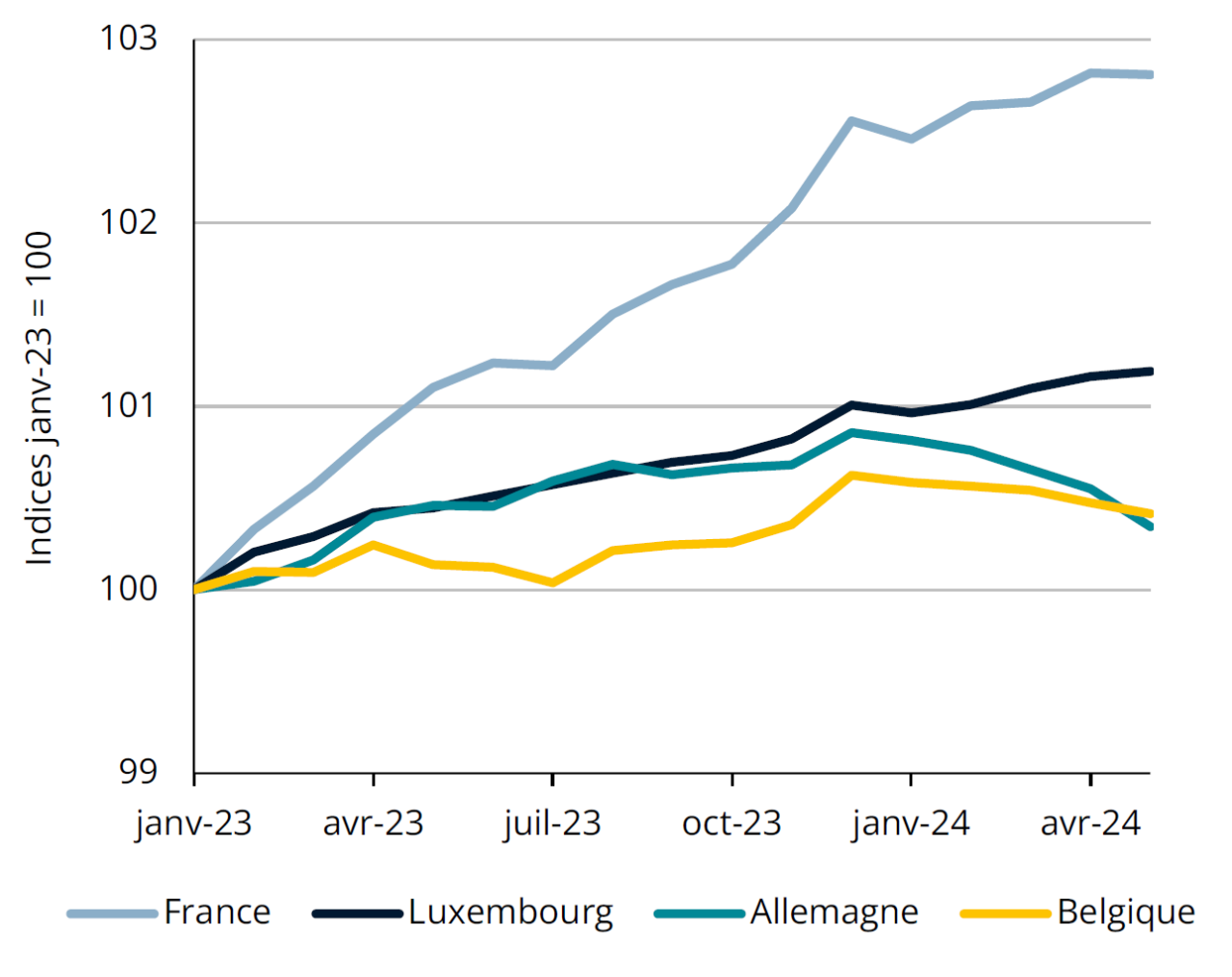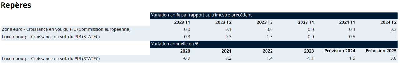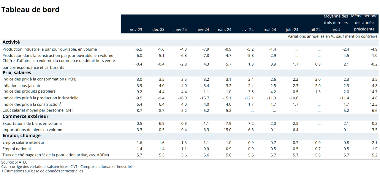 Le renforcement de l’activité observé sur la première partie de 2024 pourrait cependant ne pas perdurer. En effet, les résultats des enquêtes de conjoncture ont eu tendance à se détériorer récemment. L’indicateur du climat économique en zone euro (Commission européenne) s’est replié en juin et juillet – aussi bien pour l’industrie que pour les services – et les indices PMI[4] ont fait de même. Les résultats de l’enquête PMI d’août, déjà disponibles, montrent cependant une nouvelle accélération de l’activité, mais celle-ci reposerait principalement sur celle des services de la France (qui pourrait avoir bénéficié d’un effet « Jeux olympiques », donc temporaire). Au Luxembourg, les indicateurs de confiance se sont aussi nettement dégradés en juillet dans l’industrie (au plus bas depuis 7 mois), le commerce de détail (plus bas depuis 7 mois aussi) et les autres services non financiers (plus bas depuis 10 mois), alors qu’ils avaient eu tendance à se redresser au 1er semestre.