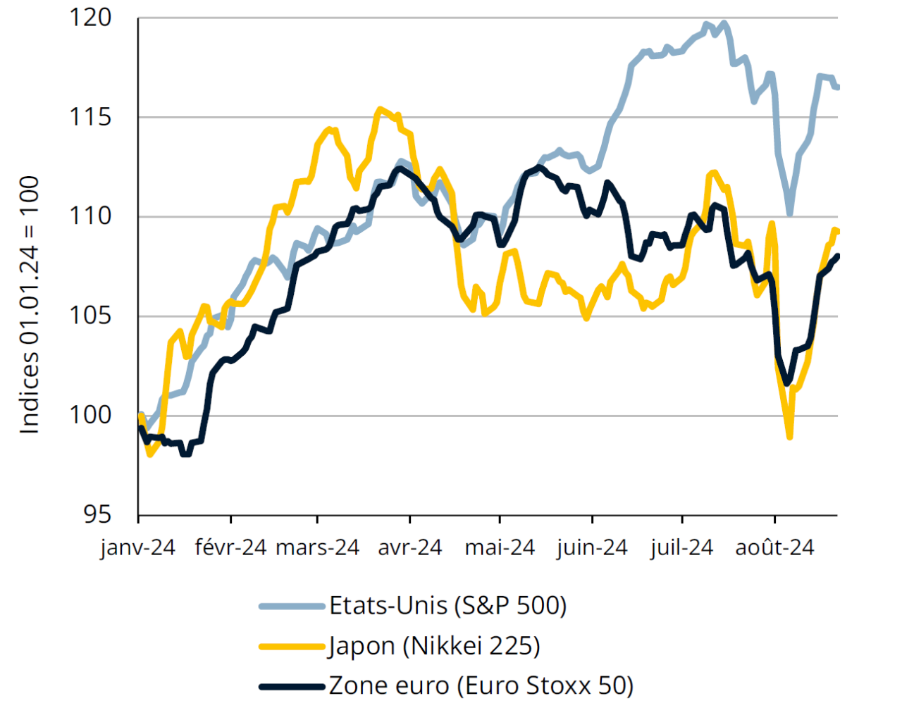 Ces corrections résultent de deux principaux facteurs : la hausse surprise des taux directeurs de la Banque du Japon et la publication de données décevantes sur l’emploi américain augmentant les craintes de récession dans un environnement de taux d’intérêt élevés. Le décrochage a été amplifié par la forte appréciation du yen (liée à la hausse des taux directeurs) qui a entraîné le dénouement d’opérations de carry trade (dans lesquelles les investisseurs avaient emprunté en yens pour investir dans des actifs étrangers à plus haut rendement). L’Euro Stoxx n’a pas été épargné, après avoir déjà perdu du terrain depuis juin en raison des tensions politiques en France, pays originaire de 40% des capitalisations de l’indice européen.