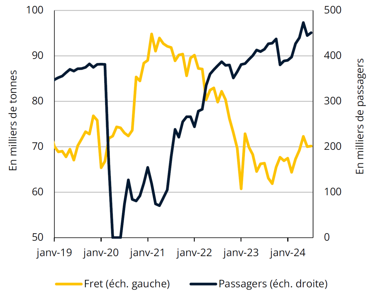 Dans le domaine du fret, le Luxembourg a bénéficié d’un niveau d’activité relativement élevé durant la pandémie (surtout par rapport à la France et à l’Allemagne), mais a nettement reflué en 2022 et s’est plus ou moins stabilisé en 2023. Au début de 2024, le fret aérien du Luxembourg renoue avec une tendance légèrement haussière et enregistre une progression de quelque 3% par rapport à l’année précédente (sur les 7 premiers mois).