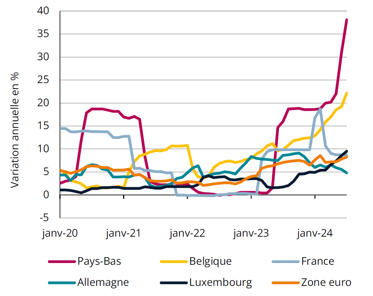 Les prix des produits de tabac ont considérablement augmenté dans certains pays de la zone euro sur les derniers mois. Les Pays-Bas marquent, avec 38%, la hausse la plus importante sur un an en juillet, suivi de la Belgique (+22%), de la Lettonie (+13%) et du Luxembourg (+9.5%). Cette évolution s’explique surtout par un relèvement des taxes sur le tabac dans ces pays. Hors taxes, la progression aurait été de 2.5% à 6.0% dans ces quatre pays. Au Luxembourg, tout comme en France (+8.5%), l’évolution des prix du tabac sur les douze derniers mois reste proche de la moyenne européenne (+8.3%).