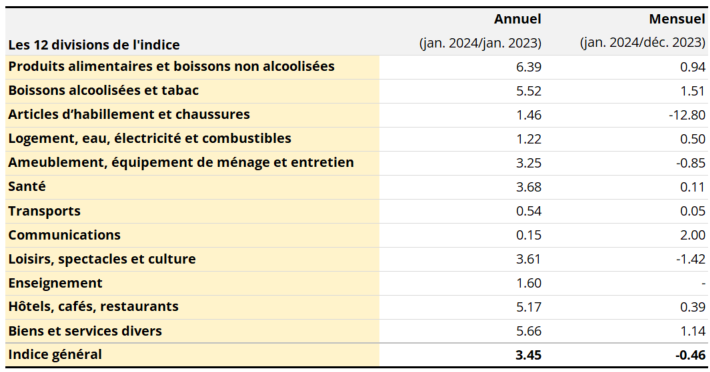 Les prix de l’alimentation gagnent 1.1% par rapport à décembre. Les plus fortes hausses ont été constatées pour le poisson frais (+12.5%), les fruits de mer frais (+6.5%) et les pizzas et quiches (+2.9%). Du côté des baisses, les eaux minérales (-1.1%), les fruits frais (-0.5%) et le lait écrémé et demi-écrémé (-1.0%) se démarquent. En comparaison annuelle, les prix alimentaires dans leur ensemble sont supérieurs de 6.4% en janvier 2024.