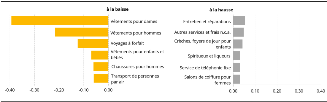 Note : Les positions représentées dans les graphiques sont celles ayant eu le plus d’influence sur l’évolution mensuelle de l’indice général. Ces contributions résultent de l’évolution mensuelle des prix mais aussi du poids de chaque position au sein du panier de biens et services. La somme des contributions individuelles de toutes les positions du panier correspond à l’évolution mensuelle de l’indice général.