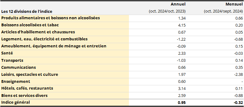 Le taux annuel d’inflation se fixe à 1.0% contre 1.3% un mois plus tôt. Le taux annuel d’inflation sous-jacent perd 0.5 point et s’établit à 1.8% en octobre. L'indice général du mois d’octobre exprimé en base 100 en 2015 se chiffre à 122.91 points. La moyenne semestrielle de l’indice raccordé à la base 1.1.1948 passe de 1012.12 à 1012.15 points. La prochaine indexation sera déclenchée lorsque la valeur de 1013.46 sera atteinte.