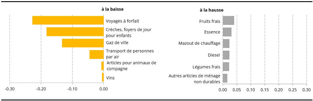 Note : Les positions représentées dans les graphiques sont celles ayant eu le plus d’influence sur l’évolution mensuelle de l’indice général. Ces contributions résultent de l’évolution mensuelle des prix mais aussi du poids de chaque position au sein du panier de biens et services. La somme des contributions individuelles de toutes les positions du panier correspond à l’évolution mensuelle de l’indice général.