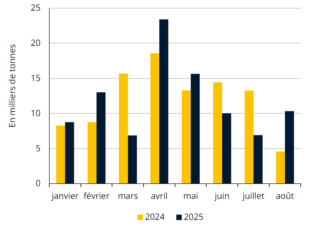 Cette baisse des volumes exportés côté luxembourgeois doit être mise en perspective avec la tendance relevée au niveau européen, à savoir un recul encore plus prononcé, de presque 10% pour l’UE dans son ensemble (toujours sur les 8 premiers mois de 2025). Les résultats sont cependant très contrastés selon les Etats-membres. Le repli européen s’explique essentiellement par ceux enregistrés par l’Espagne (-20%), les Pays-Bas (-12%) ainsi que – dans une moindre mesure – la Finlande (-27%), la Grèce (-20%) et l’Allemagne (-6%). Pour d’autres pays, on relève sur la même période une croissance à deux chiffres, notamment pour la Belgique, le Danemark ou l’Irlande.