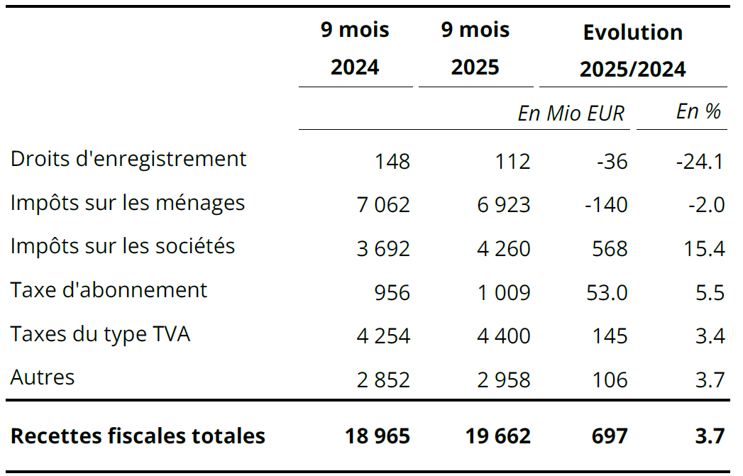 Le projet de budget 2026 intègre des nouvelles mesures qui devraient avoir un impact positif sur les recettes : l’augmentation des taux de cotisation liée à la réforme du système de pension (+378 Mio EUR dès 2026 selon les estimations du projet), l’introduction de l’impôt minimum « Pilier 2 » sur les entreprises (+80 Mio EUR) et la hausse des accises sur le tabac et les cigarettes (+35 Mio EUR).
