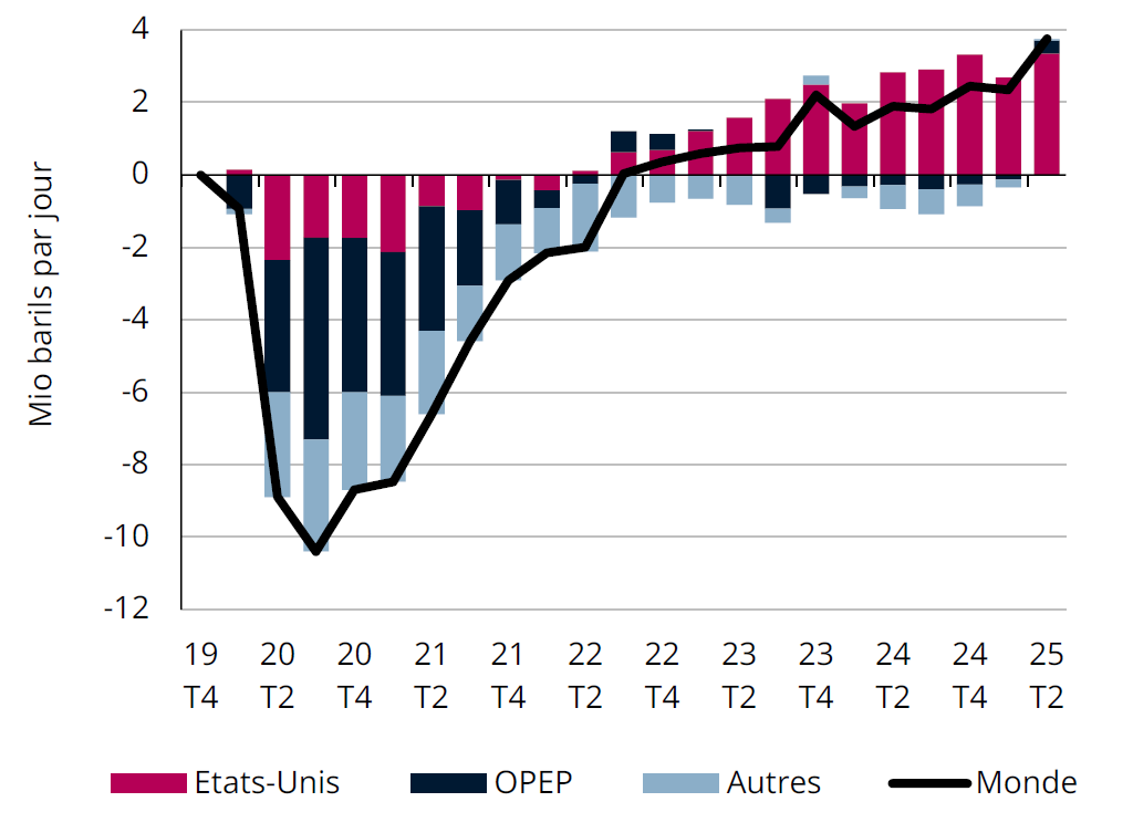 Après la chute historique de la production mondiale de pétrole liée à la crise Covid (avec des prix négatifs sur les contrats à terme américains en avril 2020), celle-ci a fortement rebondi, atteignant un nouveau record au 2e trimestre 2025. La hausse de la production par rapport à la situation d’avant Covid est presque entièrement portée par les États-Unis, désormais premier producteur mondial, et ce, même avant le retour de Donald Trump et sa politique de « Drill Baby Drill ». Ce n’est que depuis le début de 2025 que les pays de l’OPEP ont commencé à relever leur production, après les réductions mises en place dès la fin de 2022.