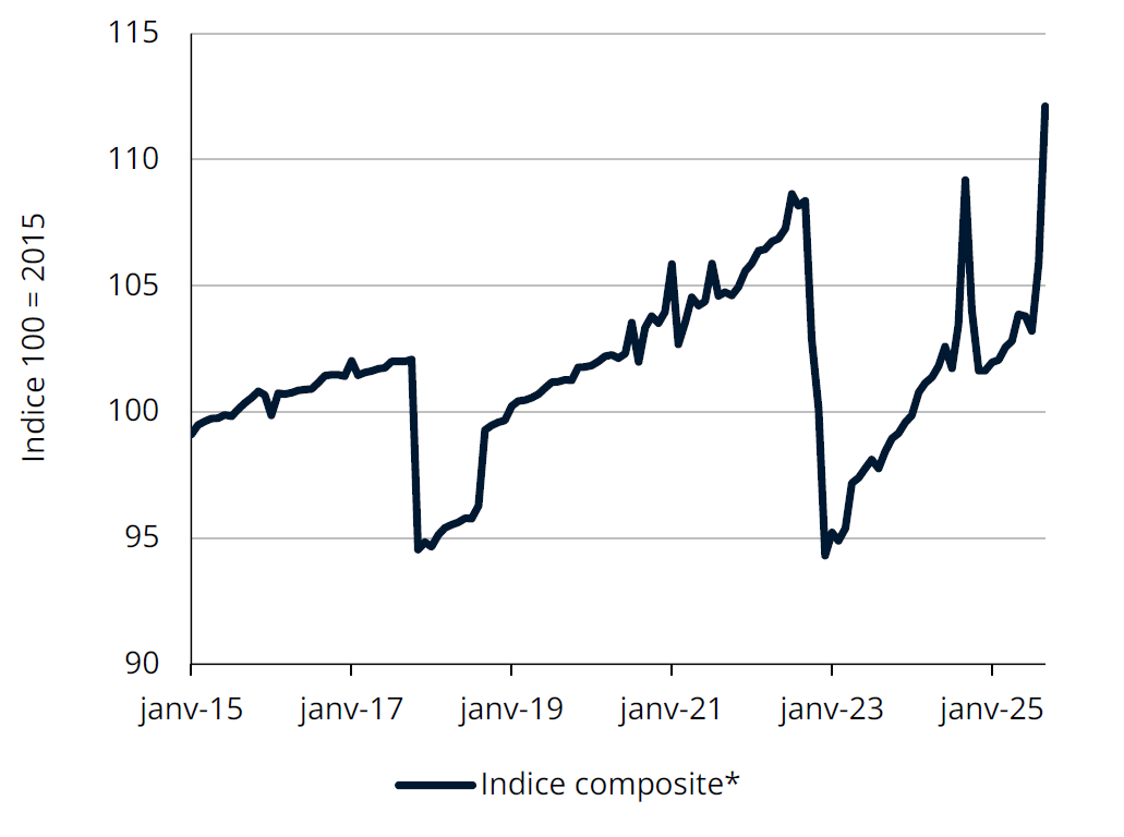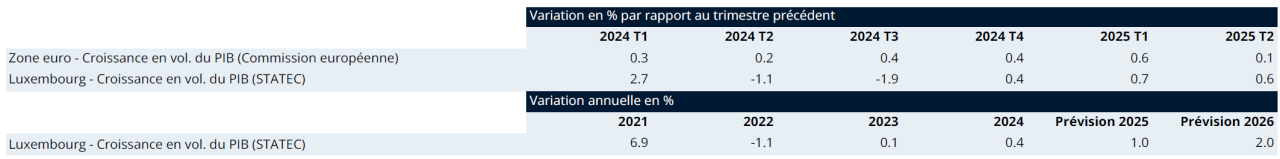 Globalement cet indicateur évolue de manière similaire au Luxembourg et en zone euro, montrant notamment de fortes hausses au moment de la pandémie de Covid (2020) et lors de la crise énergétique (2022-23). L’indicateur s’est par la suite légèrement replié mais demeure à un niveau relativement élevé par rapport à la période prépandémique.