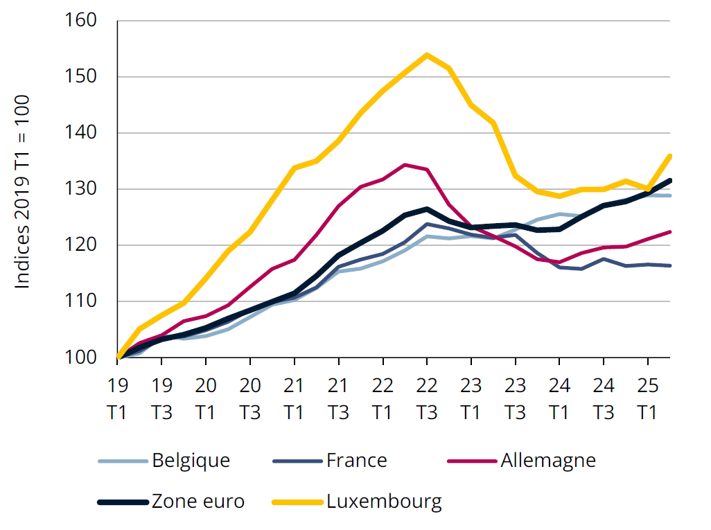 Au 2e trimestre 2025, les prix de vente des logements ont augmenté de 4.5% sur un trimestre au Luxembourg, après -1% au trimestre précédent. Cette progression particulièrement forte résulte potentiellement, comme pour les transactions, d’un effet passager en raison de l’expiration des mesures étatiques fin juin. En effet, les transactions de logements ont bondi au 2e trimestre (plus de 3 000, représentant une hausse de 85% sur un an), mais un niveau plus faible est à attendre au 3e trimestre selon le montant de nouveaux crédits octroyés durant l’été (comme au tournant de cette année, même si la tendance de fond devrait rester haussière).