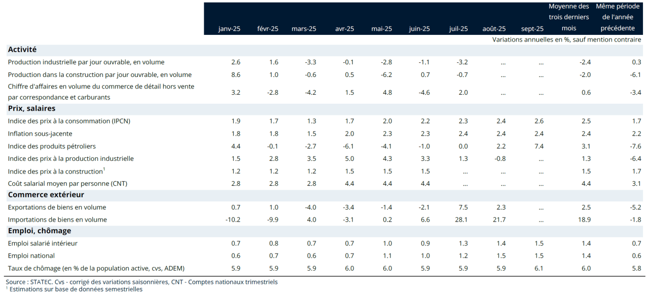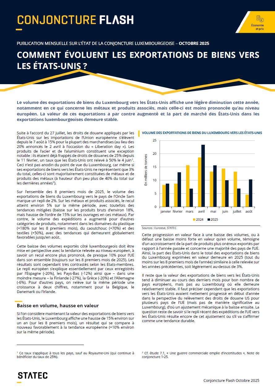 Il reste que la valeur des exportations de biens vers les États-Unis tend à diminuer au cours des derniers mois pour bon nombre de pays européens, mais pas au Luxembourg où elle demeure relativement stable. Il faut préciser cependant que les exportations vers les États-Unis avaient nettement progressé en début d’année dans la perspective du relèvement des droits de douane US pour plusieurs pays de l’UE (mais pas de manière significative au Luxembourg), d’où un ajustement mécanique à la baisse ensuite. La question reste de savoir si le repli récent des expéditions de l’UE vers les États-Unis résulte encore de cet ajustement ou s’il va s’affirmer comme une tendance durable.