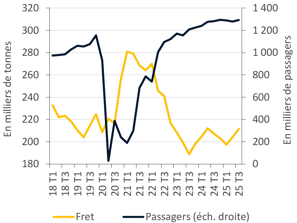 Le nombre de passagers recensés à l’aéroport de Luxembourg tend à se stabiliser. Sur les 9 premiers mois de 2025, il affiche une hausse de 1.2% sur un an. En 2024, il avait progressé d’environ 7.5%, un résultat très similaire à ceux observés en Allemagne et en Belgique (la hausse était moins prononcée en France, +4.5%), et avait dépassé pour la première fois la barre des 5 millions (ce qui devrait encore être le cas cette année). Il faut noter que le nombre de passagers au Luxembourg avait déjà dépassé son niveau pré-pandémie dès 2023, alors que ce n’était pas encore le cas pour les trois pays frontaliers du Luxembourg en 2024 (-12% par rapport à 2019 en Allemagne,