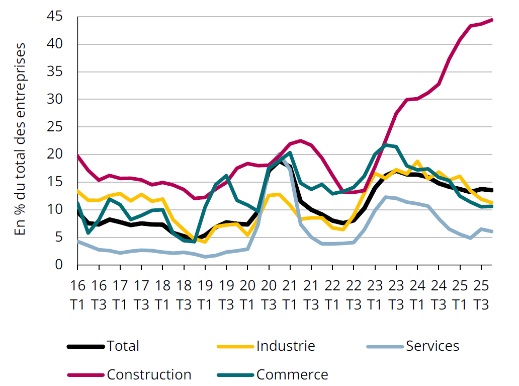 Ce reflux de la rétention de main-d’œuvre s’observe dans la plupart des branches (industrie, commerce et services), tant au Luxembourg qu’en zone euro, à l’exception notable de celle de la construction. Pour cette branche, la rétention tend à se stabiliser en zone euro, mais elle continue à augmenter au Grand-Duché cette année (après deux années de très forte hausse, renvoyant à la dégradation particulièrement marquée de l’activité dans la construction).