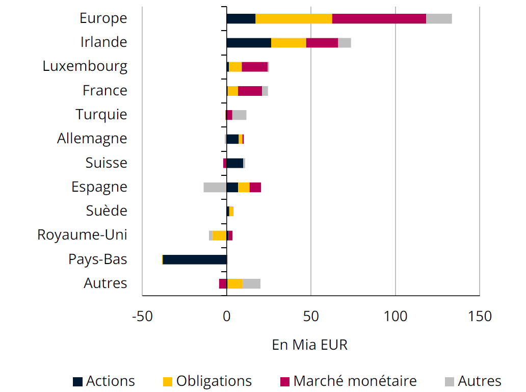 Au 3e trimestre, la confiance des investisseurs s'est encore améliorée, soutenue par des perspectives moins incertaines concernant la future politique commerciale et monétaire américaine. Les marchés ont été principalement influencés par des attentes de baisse des taux directeurs aux Etats-Unis, alors qu’aucune nouvelle baisse n’est attendue en zone euro depuis juin. Les taux à long terme y sont en revanche orientés à la hausse. Dans ce contexte, les catégories d'OPC à actions et à revenu fixe ont enregistré un investissement en capital globalement positif. Les émissions nettes dans les fonds au Luxembourg ont même atteint en août un niveau record depuis 2021.