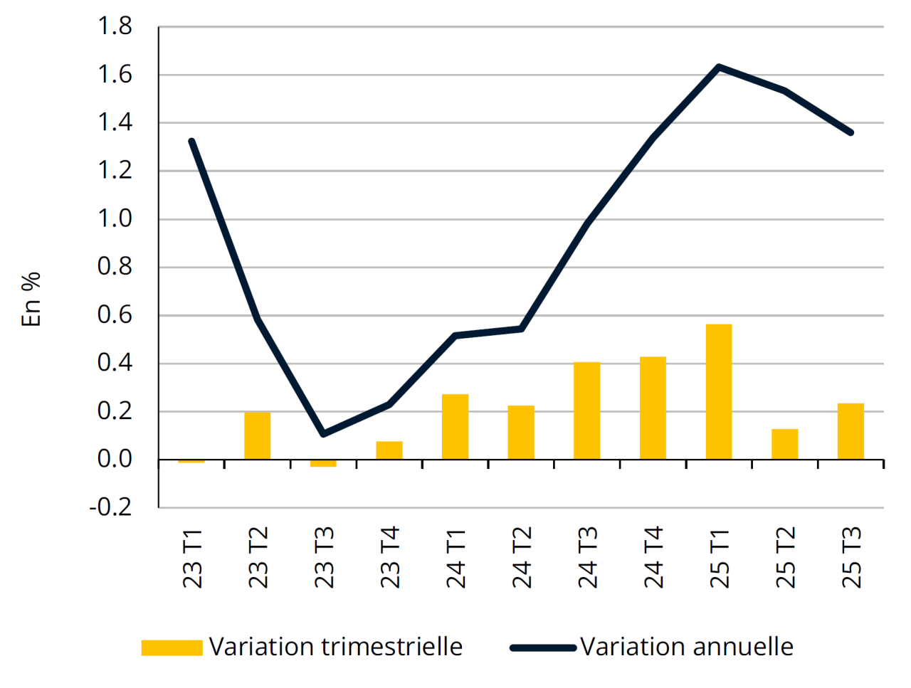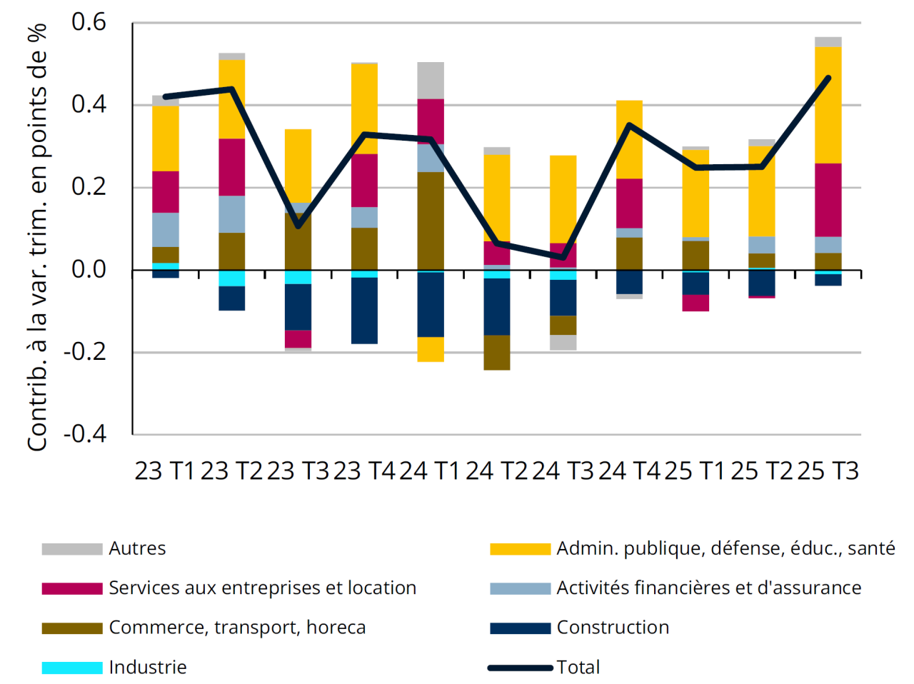 Au niveau des branches, ce sont surtout les services aux entreprises qui contribuent à cette amélioration (notamment le travail intérimaire, qui avait fortement baissé en T1 et T2, et les services relatifs aux bâtiments et aménagement paysager), mais aussi le secteur public (qui demeure le principal créateur d’emplois en T3 2025). La construction enregistre pour sa part encore une baisse sur l’ensemble du 3e trimestre, mais celle-ci est bien moins prononcée que sur les trimestres précédents (les effectifs ont même légèrement augmenté sur les données mensuelles d’août, septembre et octobre).