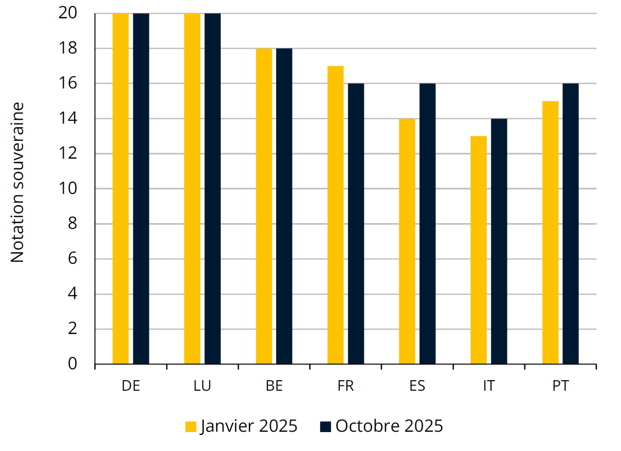A l’automne 2025, la France a vu sa notation souveraine dégradée par Fitch et S&P Global Ratings, sur fonds de crise politique conjuguée à un déficit budgétaire excessif et une dette publique croissante. Cette chute de la notation de la France devrait alourdir son taux d’emprunt et diminuer l’attrait de ses campagnes futures d’émissions d’obligations souveraines. La notation souveraine de la Belgique – deux crans plus élevée que celle de la France – a été assortie d’une perspective négative à cause de risques accrus liés à la mise en œuvre d’une consolidation budgétaire et à une vulnérabilité économique forte. L’Allemagne et le Luxembourg ont quant à eux conservé la notation maximale (triple A), assortie d’une perspective stable, grâce notamment à l’efficacité et la transparence de leurs cadres institutionnels et budgétaires.