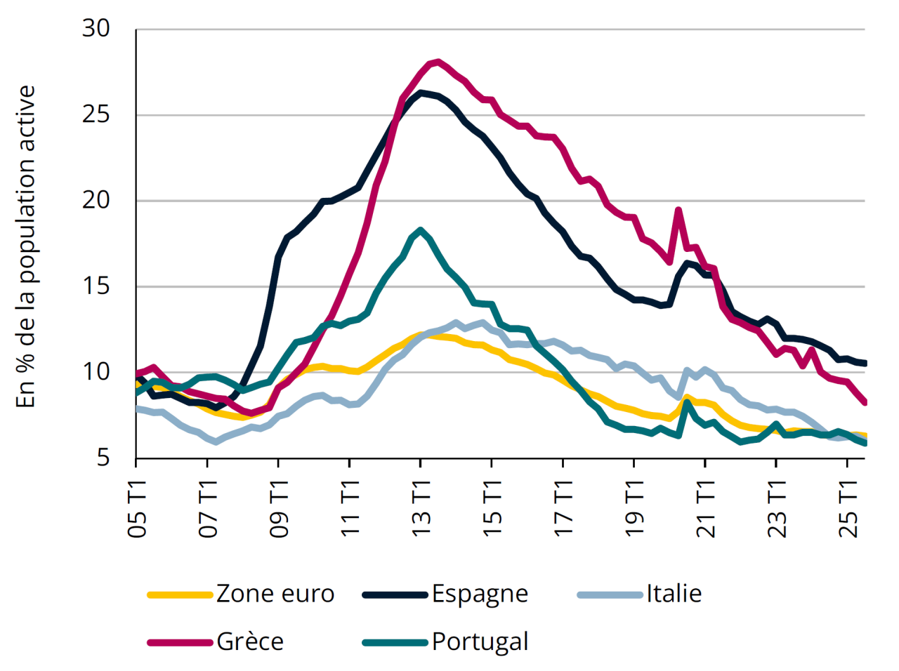 Avec les crises des subprimes et des dettes souveraines, le chômage avait fortement augmenté en zone euro (de 7.7% de la population active en 2008 à 12.1% en 2013) et même explosé dans les pays du Sud. Malgré une baisse continue depuis 2014, avec une courte interruption en 2020 pendant la pandémie du COVID-19, l’Espagne et la Grèce affichent encore des taux de chômage parmi les plus élevés (à resp. 10.5% et 8.3% au 3e trimestre de 2025). La Finlande a aussi connu une forte hausse des demandeurs d’emplois depuis l’invasion russe en Ukraine (le taux étant passé de 6.4% en T2 2022 à 9.9% en T3 2025).