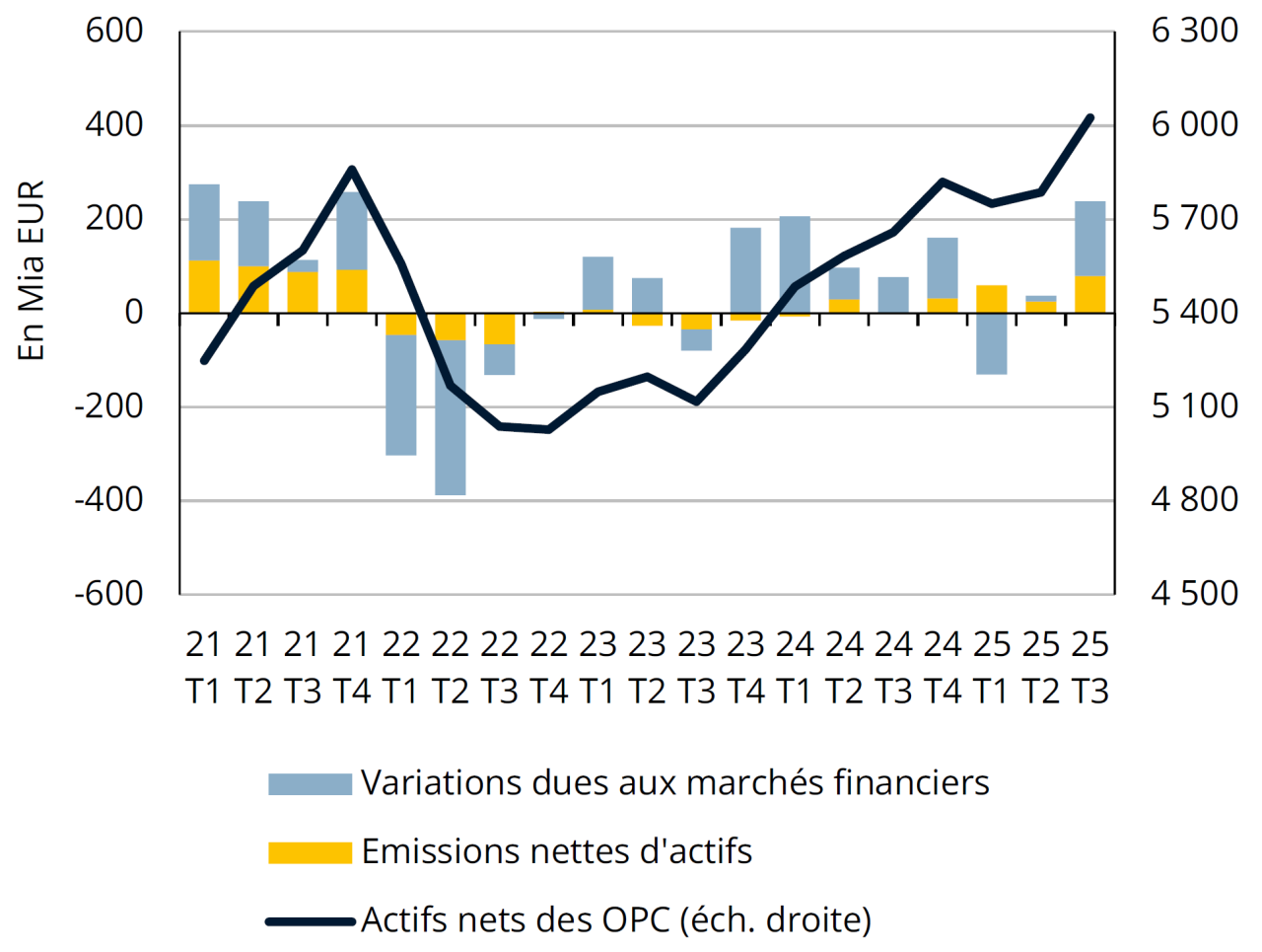 Au 3e trimestre, les organismes de placement collectif (OPC) du Luxembourg ont vu leurs actifs nets augmenter de 6.5% sur un an. Cette progression provient en grande partie d’une remontée des valorisations des actions (+159 Mia EUR sur un trimestre), portées par de meilleures perspectives des investisseurs concernant la politique commerciale et monétaire américaine, la croissance mondiale et par les investissements dans l’intelligence artificielle (malgré les inquiétudes croissantes liées aux niveaux de valorisation élevés et à la concentration du marché). Selon la CSSF, les actions latino-américaines et asiatiques ont enregistré les meilleures performances alors que les actions européennes ont affiché des gains plus modestes, en raison des perspectives économiques mitigées en Allemagne et de l'instabilité politique en France.