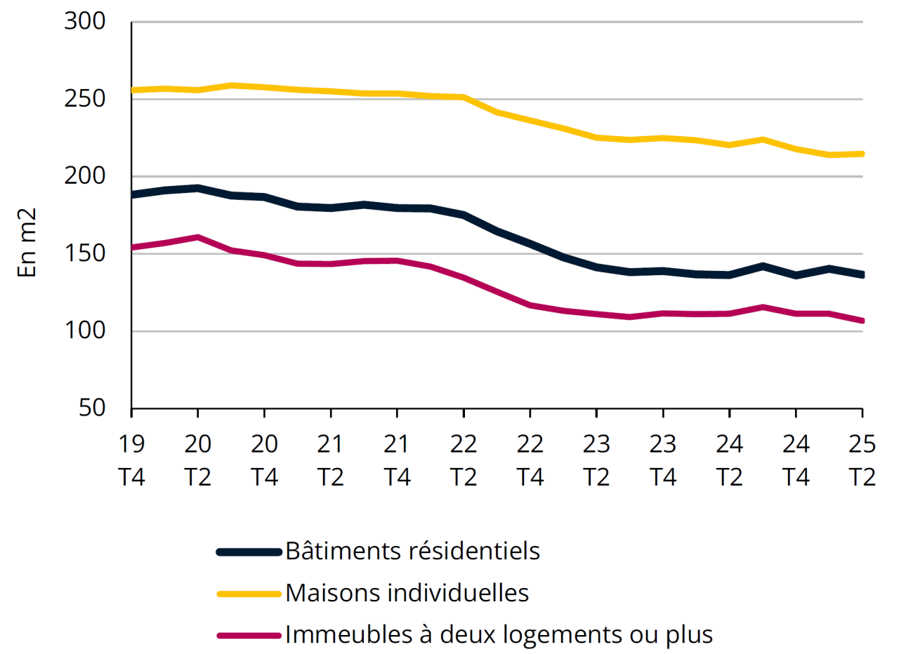 Cette tendance s’observe également pour les appartements neufs dans les statistiques des actes de vente (qui reprennent directement la surface des appartements vendus). La surface moyenne des appartements vendus en construction ne s’élève qu’à environ 77 m2 depuis 2023, alors qu’elle était d’environ 82 m2 sur les dix années précédentes. Au 1er semestre 2025, elle est même tombée à 71 m2, un plus bas enregistré jusqu’à présent.