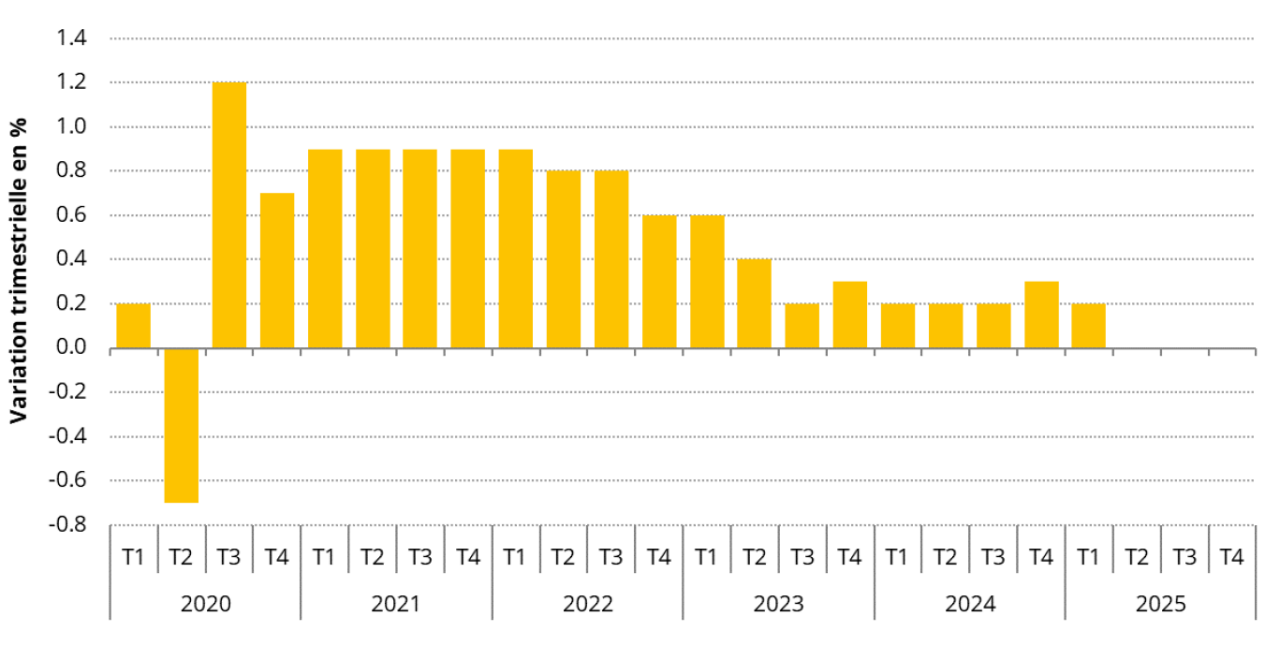 Comme lors des trimestres précédents la progression trimestrielle de l’emploi salarié est restée très modérée avec une hausse de 0.2% par rapport au quatrième trimestre 2024. En variation annuelle la progression atteint 0.9%. Les activités du commerce, de transport, d’hébergement et de restauration (+0.6%), ainsi que l’administration et les autres services publics (+0.9%) affichent les plus fortes progressions trimestrielles par rapport au quatrième trimestre 2024. En revanche les secteurs d’activités de la construction, de l’information et de la communication, ainsi que les activités spécialisées et les services de soutien, ont enregistré une baisse du nombre de salariés au premier trimestre 2025.