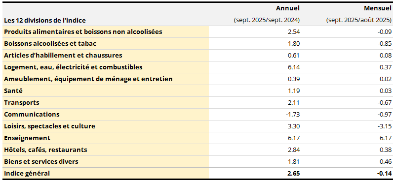 Le taux annuel d’inflation se fixe à 2.7% contre 2.4% un mois plus tôt. Le taux annuel d’inflation sous-jacent reste inchangé par rapport à août et s’établit à 2.4% en septembre. L'indice général du mois d’août exprimé en base 100 en 2015 se chiffre à 126.57 points. La moyenne semestrielle de l’indice raccordé à la base 1.1.1948 passe de 1030.48 à 1033.72 points. La prochaine indexation sera déclenchée lorsque la valeur de 1038.79 sera atteinte.