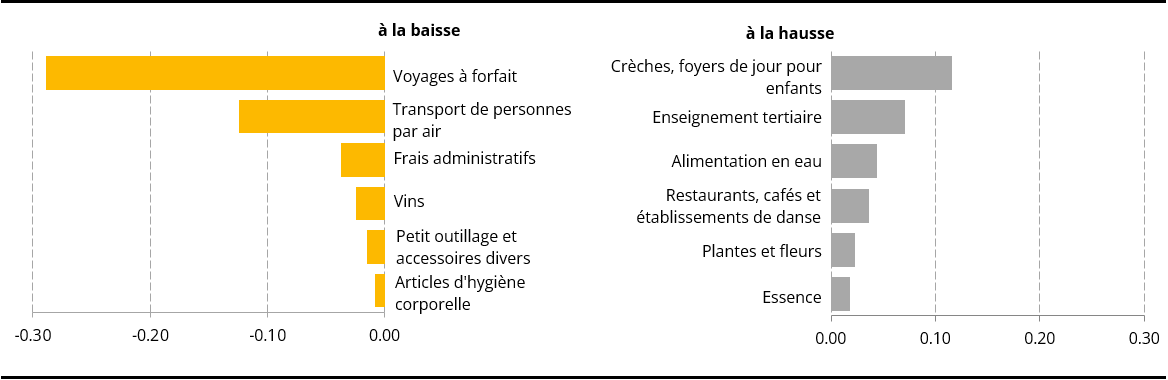 Note : Les positions représentées dans les graphiques sont celles ayant eu le plus d’influence sur l’évolution mensuelle de l’indice général. Ces contributions résultent de l’évolution mensuelle des prix mais aussi du poids de chaque position au sein du panier de biens et services. La somme des contributions individuelles de toutes les positions du panier correspond à l’évolution mensuelle de l’indice général.