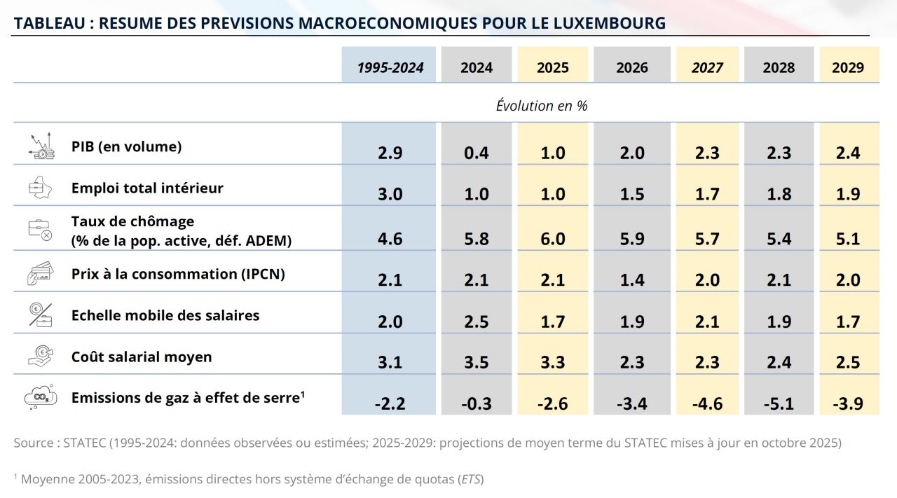 À partir de 2026, en lien avec le redressement de l’activité économique attendu, le STATEC anticipe un renforcement modéré de la croissance de l’emploi (+1.5%) accompagné d’une légère baisse du taux de chômage (de 6% à 5.9%), avec un soutien accru du secteur marchand.