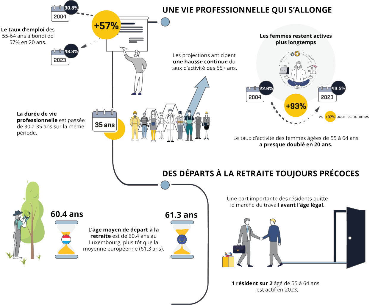 Le taux d’activité des 55 à 64 ans a progressé de 57% depuis 2004, et la durée de vie professionnelle est passée de 30 à 35 ans. Pourtant, l’âge moyen de départ à la retraite reste bas (60.4 ans), inférieur à la moyenne européenne (61.3 ans), et de nombreuses personnes quittent le marché du travail avant l’âge légal.