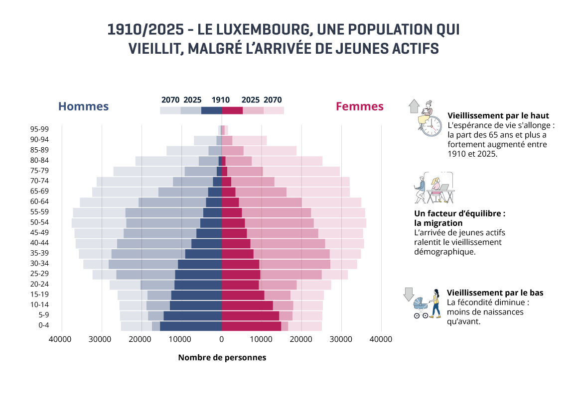 Le rapport consacre sa partie thématique cette année au vieillissement de la population, un phénomène encore modéré au Luxembourg (15% de 65 ans et plus en 2024 contre 21.6 % dans l’UE-27), mais en progression. Ce phénomène résulte de deux dynamiques principales : la baisse durable de la fécondité (vieillissement par le bas) et l’allongement de l’espérance de vie (vieillissement par le haut). Cette évolution est, en revanche, freinée par l’arrivée de jeunes actifs via la migration.
